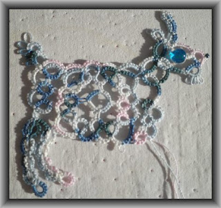 I'm a little slow with this submission. We have been filling out forms for my daughter's college. My brain was so tired, I couldn't even tat 4 rings and chains between! But finally, between chores on Sunday, I figured out I must have done it correct enough. Can't wait till Thursday.
