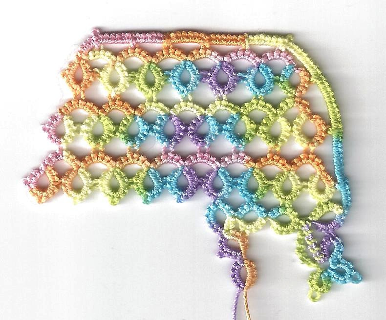 I did quite a bit of "fiddling around", as for some unknown reason I did not load enough thread on the shuttles, so I have been "shoelacing" like crazy to try and make do with the thread I have.. (for your eyes, I am away from home...). I also played around with the stitch counts on the long chain,a s the CWJ seemed to make it smooth, but also make it bulge because of the extra space used b the full ds... so, I took the liberty of doing a bit fewer here and there.