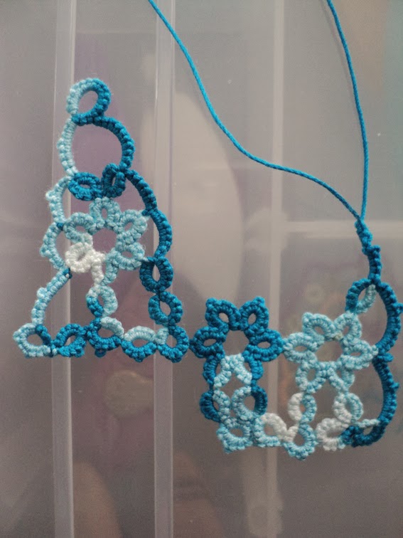 "Had to play catch-up!!! I've had some very busy past 2 days. Unfortunately, i'm afraid that the stress has just began! Anyways, I still have no guesses as to what we are constructing. Happy tatting from knotty Michelle! !!"