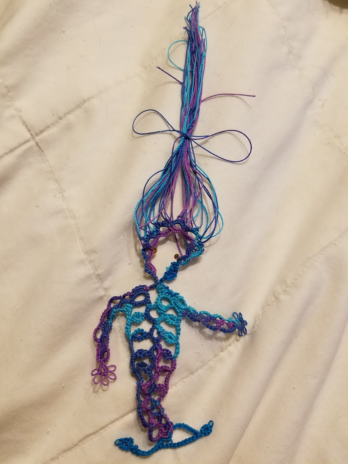 The little mermaid is tatted using Lizbeth sz 20 thread in Rainbow Taffy and her hair is embroidery thread from my stash.